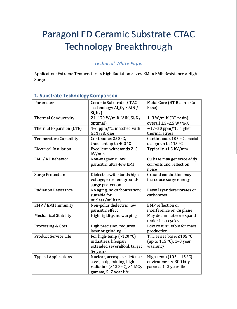 ParagonLED Ceramic Substrate CTAC Technology Breakthrough